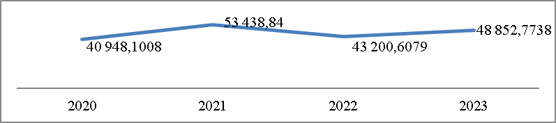 Плавное увеличение исследуемого показателя в 2023 году ознаменовано существенным его ростом почти в 4,8 раза по отношению к 2022 г. Данное благоприятное явление, по нашему мнению, отражает рост инновационного развития промышленного комплекса региона.