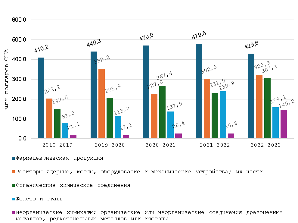СГТР импорта с 2019 по 2023 год по первой категории, отмеченной синим цветом, составил 9,2%, по второй, отмеченной оранжевым, – 9,7%. В 2023 году импорт продукции из группы «Неорганические химикаты…» существенно увеличился и достиг отметки в 145,2 млн долларов, что в 5,7 раз выше показателя прошлого года.