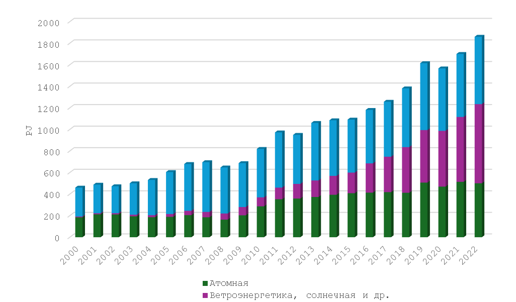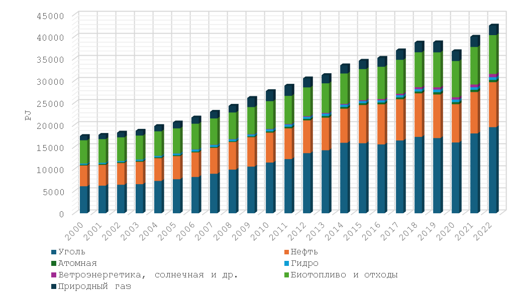 Рисунок 4 – динамика изменения спроса на разные виды энергоресурсов с 2000 по 2022 год в петаджоулях (PJ), составлено автором на основе данных Международного энергетического агентства [11].