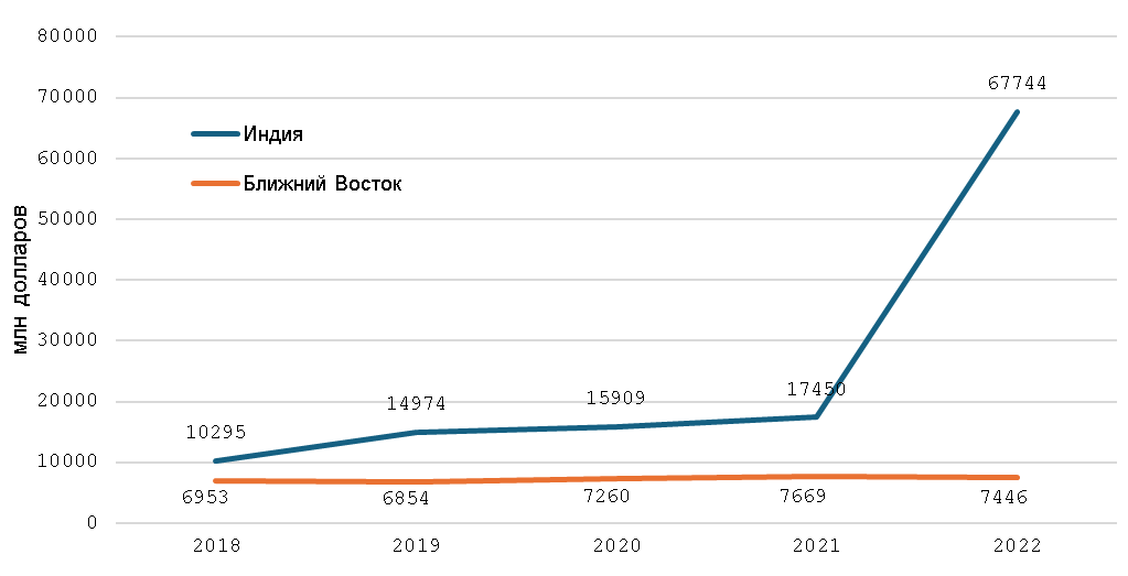 Положительным результатом развития данного коридора можно считать кратный рост поставок в Индию за период с 2018 по 2022 годы и стабильный грузопоток в страны Ближнего Востока.