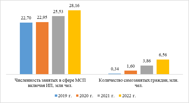 Основываясь на данных доклада Минэкономразвития России о состоянии малого и среднего предпринимательства и мерах по его развитию за 2019-2022 гг., можно констатировать рост численности занятых в данной сфере, включая индивидуальных предпринимателей (МСП / ИП) на 24% за четырехлетний период. Количество самозанятых граждан за этот период выросло почти в 20 раз.