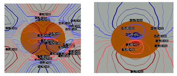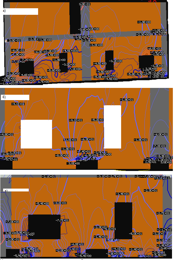 На рис. 6 показан пример использования программного комплекса ПОЛЮС при моделировании процесса выравнивания здания. Рассмотрен начальный вариант модели, в котором не учитывалось усиление стен. Показан фрагмент стены на одном из этапов увеличения нагрузки на домкраты (60% усилия). Отчетливо видно образование линии отрыва по нижнему образу стен, а также образование зон разрушения стены в окрестностях оконных и дверных проемов, что позволяет уточнить инженерные решения при усилении здания. На рис. 7 показаны напряжения в шпильке усиления на одном из этапов подьема.