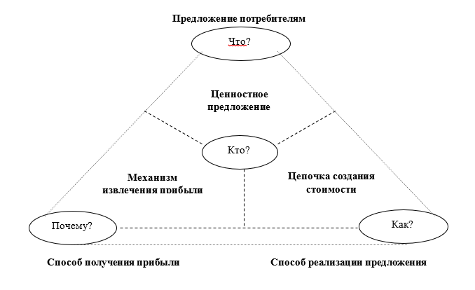 Общая модель бизнеса, предложенная О. Гассманом, К. Франкенбергером и М. Шиком, состоит из четырёх элементов: клиент – определение целевых клиентов и сегментов потребителей, на которые ориентируется компания; ценностное предложение – определение товаров и услуг, которые предлагает компания, и способов удовлетворения потребностей целевых групп покупателей; цепочка создания стоимости – реализация ценностного предложения через соответствующие ресурсы и процессы; механизм извлечения прибыли – объяснение процесса формирования выручки и затрат, а также экономической состоятельности бизнес-модели. Ученые О. Гассман, К. Франкенбергер и М. Шик предлагают рассматривать бизнес-модель как систему, состоящую из четырёх взаимосвязанных элементов: клиента, ценностного предложения, инфраструктуры и эффективности, которые в совокупности определяют стратегию и тактику компании, её конкурентные преимущества. Таким образом, по мнению ученых, формирование эффективной бизнес-модели можно представить в форме «волшебного треугольника» (рис.1).