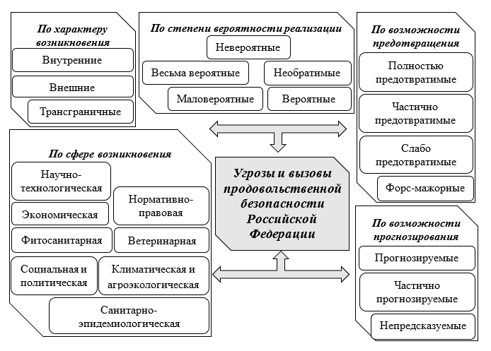 На Рисунке 1 представлена классификация актуальных угроз и вызовов продовольственной безопасности Российской Федерации. Границы пространства реализации потенциальных угроз и вызовов внутреннего характера определяются территориальными границами России. Так, существующие угрозы и вызовы обеспечения продовольственной безопасности России классифицируются: по характеру возникновения на внутренние, трансграничные и внешние; по возможности прогнозирования: прогнозируемые, частично прогнозируемые, непредсказуемые; по сфере возникновения на научно-технологические, экономические, социальные и политические, климатические и агроэкологические, санитарно-эпидемиологические, фитосанитарные, ветеринарные, нормативно-правовые; по степени вероятности реализации: невероятные, маловероятные, вероятные, весьма вероятные, необратимые; по возможности предотвращения: полностью предотвратимые, частично предотвратимые, слабо предотвратимые и форс-мажорные.