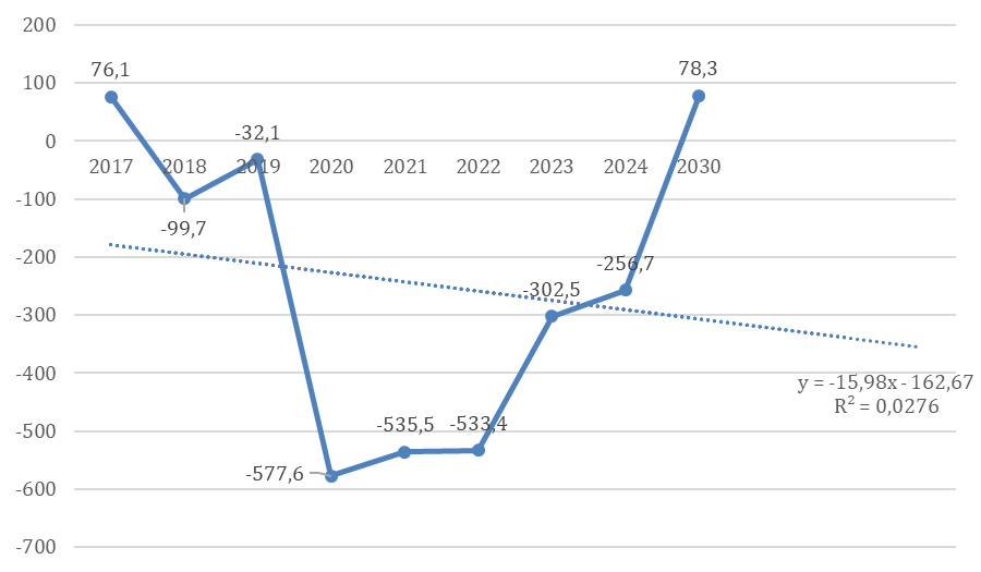 - линейный прогноз: y = -15,98x - 162,67; R² = 0,0276;