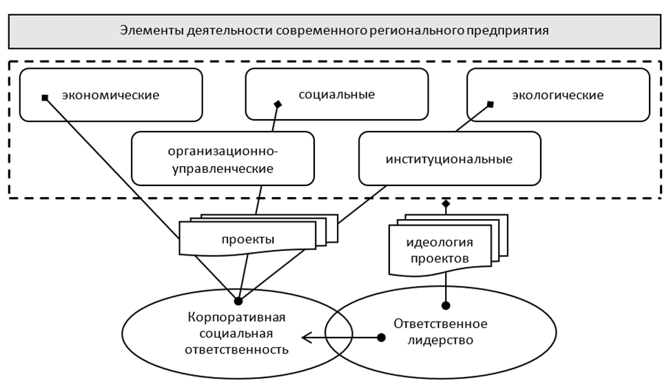 «Культура» ответственного лидерства возникает не стихийно, а формируется в процессе становления предприятия (организации) и целенаправленно влияет на все его процессы, задает «правила» поведения не только лидеров предприятия, но и всех работников. В этой связи выстраивается определенная «идеология» проектов, реализуемых в рамках различных направлений (элементов) деятельности организации: экономическом, социальном, экологическом, организационно-управленческом и институциональном. Между тем, принципы социальной ответственности распространяются на отдельные направления деятельности, являющиеся приоритетными (на определенной территории, в конкретный момент времени и на конкретный срок) по решению лидеров организации и стейкхолдеров (Рисунок 2).