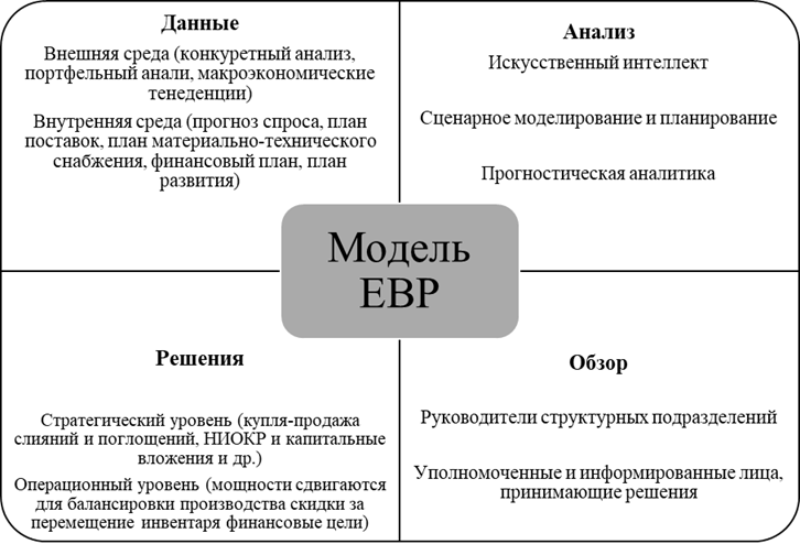 Центральным элементом EBP является одномодельный подход, то есть единая, унифицированная и виртуальная модель компании, которая включает критически важные входные данные, а именно: стратегические и операционные, краткосрочные и долгосрочные, рыночные и организационные, - и целенаправленный анализ этих данных человеко-программно-аппаратным комплексом (рис.2). Цель данного подхода состоит в предоставлении руководству компании актуальных всеобъемлющих данных для анализа, планирования и информирования обо всех типах решений.