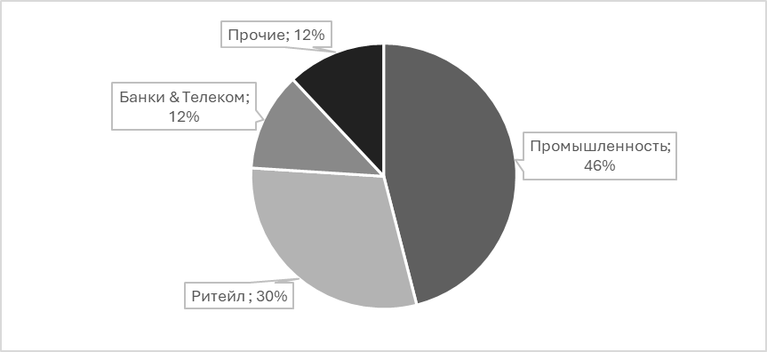 По мнению экспертов российские производственные компании только начинают понимать потребность во внедрении интегрированного бизнес-планирования и информационных систем класса IBP в свою ИТ-архитектуру. К 2028 году прогнозируется значительное увеличение доли рынка данных ИТ-решений (до 50% компаний, нуждающихся в подобных системах). Согласно текущим оценкам всего 5% компаний, для которых актуально данное программное решение, внедрили его [11]. Если рассмотреть их в отраслевой принадлежности, то она сохраняется по сравнению с прошлыми периодами (рис. 1).