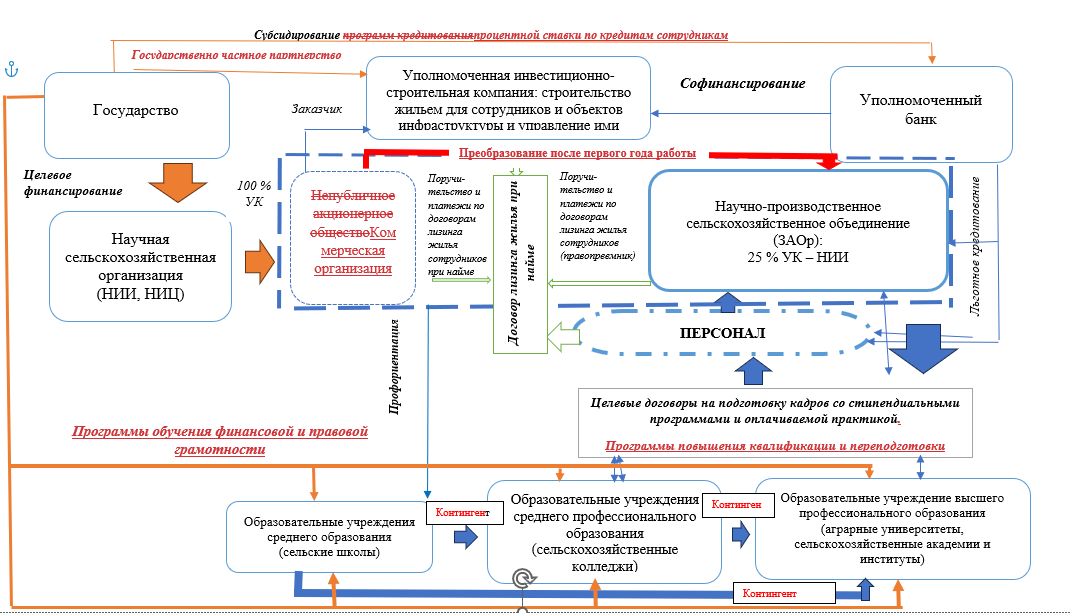 Отраслевые НИИ, являясь носителями интеллектуальной, научной базы отрасли, будут играть роль спонсора (куратора) проекта и, одновременно, непосредственного участника. Выступая учредителями в первоначально создаваемом коммерческом предприятии (далее – коммерческое предприятие), в дальнейшем они получают 25 % в уставном капитале народного предприятия являясь, по сути, представителями государства в созданном объединении. Первоначально созданное коммерческое предприятие выступит заказчиком строительства жилья для будущих сотрудников народного предприятия, а также заказчиком строительства инфраструктурных объектов. Жилье целесообразно передавать по договорам лизинга, при этом коммерческая организация выступит поручителем по договорам лизинга, на основании чего будет производить оплату взносов. После преобразования коммерческой организации в народное предприятие, оно становится правопреемником по договорам поручительств и оплате взносов.