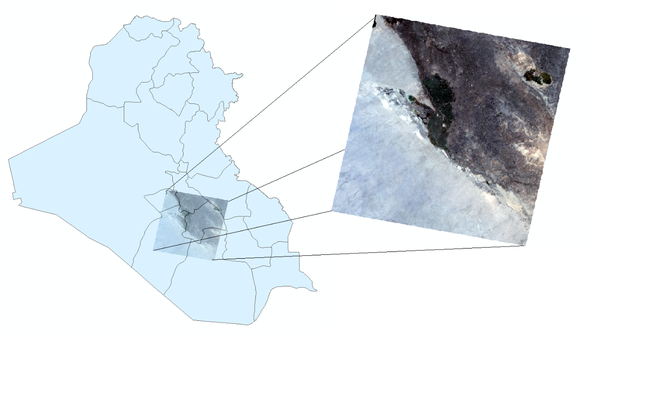 Район исследования расположен в центральной части Ирака, которая является одной из наиболее плодородных сельскохозяйственных зон, зависящих от речного орошения. Он охватывает территории между мухафазами Дивания, Наджаф, Кербела, Бабиль, Васит и Мутанна. Для анализа использовались спутниковые снимки Landsat с пространственным разрешением 30 × 30 метров, охватывающие координаты: запад — 43.440741, восток — 45.901543, север — 32.797291, юг — 30.671476. Общая площадь исследуемой территории составляет 50 437 611,9 квадратных километров, как показано на Рис. 1.
