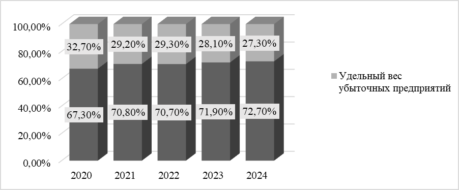 За последние пять лет (с 2020 года по 2024 год) в России доля убыточных предприятий с каждым годом уменьшается (рис. 1). Так, в 2020 году, удельный вес убыточных предприятий составлял 32,70% против 27,30% в 2024 году, их уменьшение в абсолютном выражении составляет 5,4%. Соответственно, удельный вес прибыльных предприятий увеличился, и в 2024 году составил 72,7%. На наш взгляд, данная ситуация обусловлена следующими факторами: