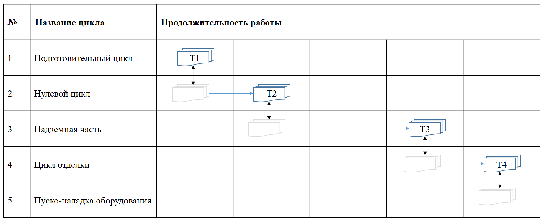 Где T — общая продолжительность работ, Т1 — продолжительность подготовительного периода; Т2 — продолжительность нулевого цикла; Т3 — продолжительность возведения надземной части здания; Т4 — продолжительность специальных работ (электромонтажных и сантехнических); Т5 — производство отделочного цикла.