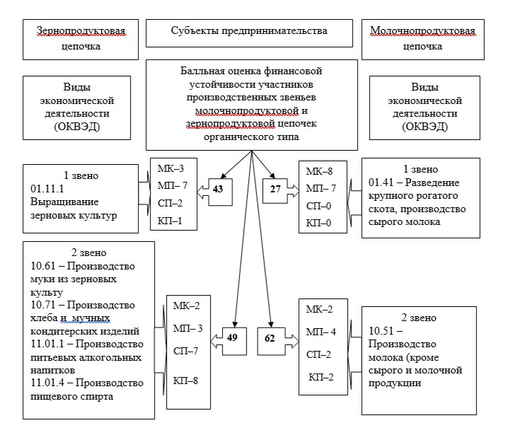 В молочнопродуктовой цепочке по первому звену анализируются 15 организаций, производящих органическое молоко, согласно ОКВЭД 01.41 занимаются разведением крупного рогатого скота и производством сырого молока и два по ОКВЭД 01.41.21 производят только сырое коровье молоко. В группе по первому звену зерновой цепочки – 13 предприятий, выращивующих органические зерновые культуры согласно ОКВЭД 01.11 – занимающихся выращиванием зерновых (кроме риса), зернобобовых культур и семян масленичных культур и четыре по ОКВЭД 01.11.1 – выращиванием только зерновых культур.