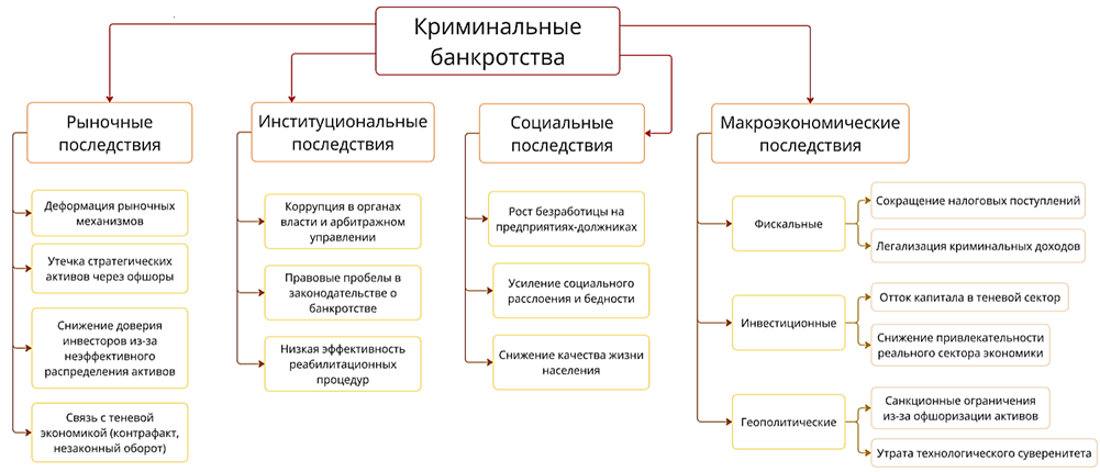 В современных экономических условиях проблема криминальных банкротств приобретает актуальность в контексте обеспечения экономической безопасности государства [5]. Банкротство как институциональный механизм разрешения финансовых кризисов предприятий в условиях криминализированной среды трансформируется из инструмента рыночной саморегуляции в системный вызов экономической безопасности государства [6]. На национальном уровне его деструктивный потенциал проявляется через множественные угрозы: во-первых, искажение функций банкротства ведет к подрыву рыночных принципов перераспределения ресурсов, формируя монополизированные структуры собственности; во-вторых, криминальные банкротства усиливают фрагментацию правовой системы, создавая зоны правового нигилизма, где судебные процедуры становятся инструментом преступных целей; в-третьих, масштабное хищение активов в рамках фиктивной несостоятельности дестабилизирует государственные финансы, так как ущемляются интересы бюджета через недополученные налоги и утрату контроля над стратегическими предприятиями [10]. Для наглядного отражения комплексного воздействия криминальных банкротств на национальную экономику представлен рисунок 1, систематизирующий ключевые последствия по четырем уровням: рыночному, институциональному, социальному и макроэкономическому.