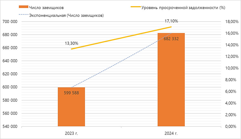 Рис. 3. Рост числа заемщиков и уровня просроченной задолженности (2023–2024)