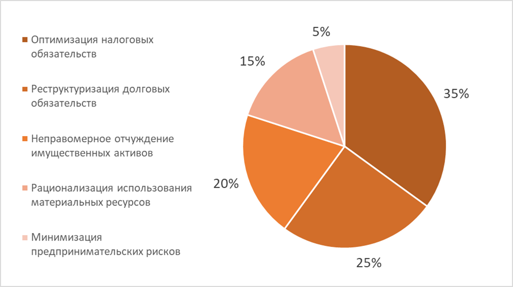 Криминальные банкротства характеризуются многоаспектностью целевых установок субъектов противоправной деятельности. Анализ современной криминологической ситуации позволяет выделить комплекс мотивационных факторов, детерминирующих совершение преступлений в данной сфере: оптимизация налоговых обязательств, реструктуризация долговых обязательств перед контрагентами, неправомерное отчуждение имущественных активов, рационализация использования материальных ресурсов для реализации более перспективных направлений предпринимательской деятельности, а также минимизация предпринимательских рисков [9].