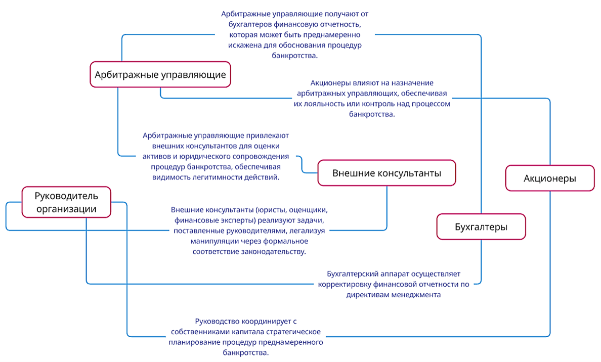 На рисунке 5 демонстрируются функциональные связи между участниками криминальных банкротств, включая руководителей, акционеров, бухгалтеров, арбитражных управляющих и внешних консультантов. Взаимодействие направлено на реализацию противоправных действий в рамках процедур банкротства.